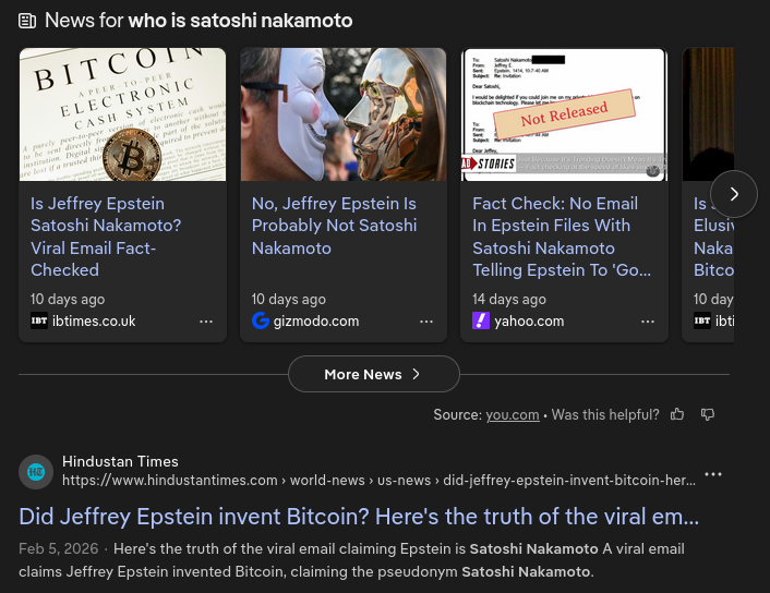 i just looked up “who is Satoshi Nakamoto” (even tho i already knew it was a group pseudonym, just double-checking), and below the duckduckgo chatgpt-wrapper and the wikipedia link is uh