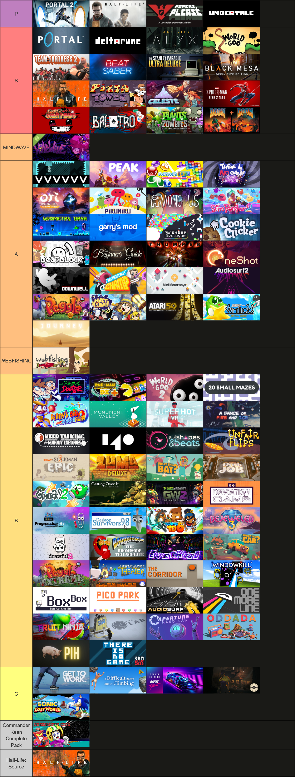 games are arranged from best to worst (but rankings are a little loose so don’t take them too seriously). with a few small exceptions, this tierlist does not include demos, playtests, mods, and games i haven’t played long enough to form an opinion on or can’t remember much about