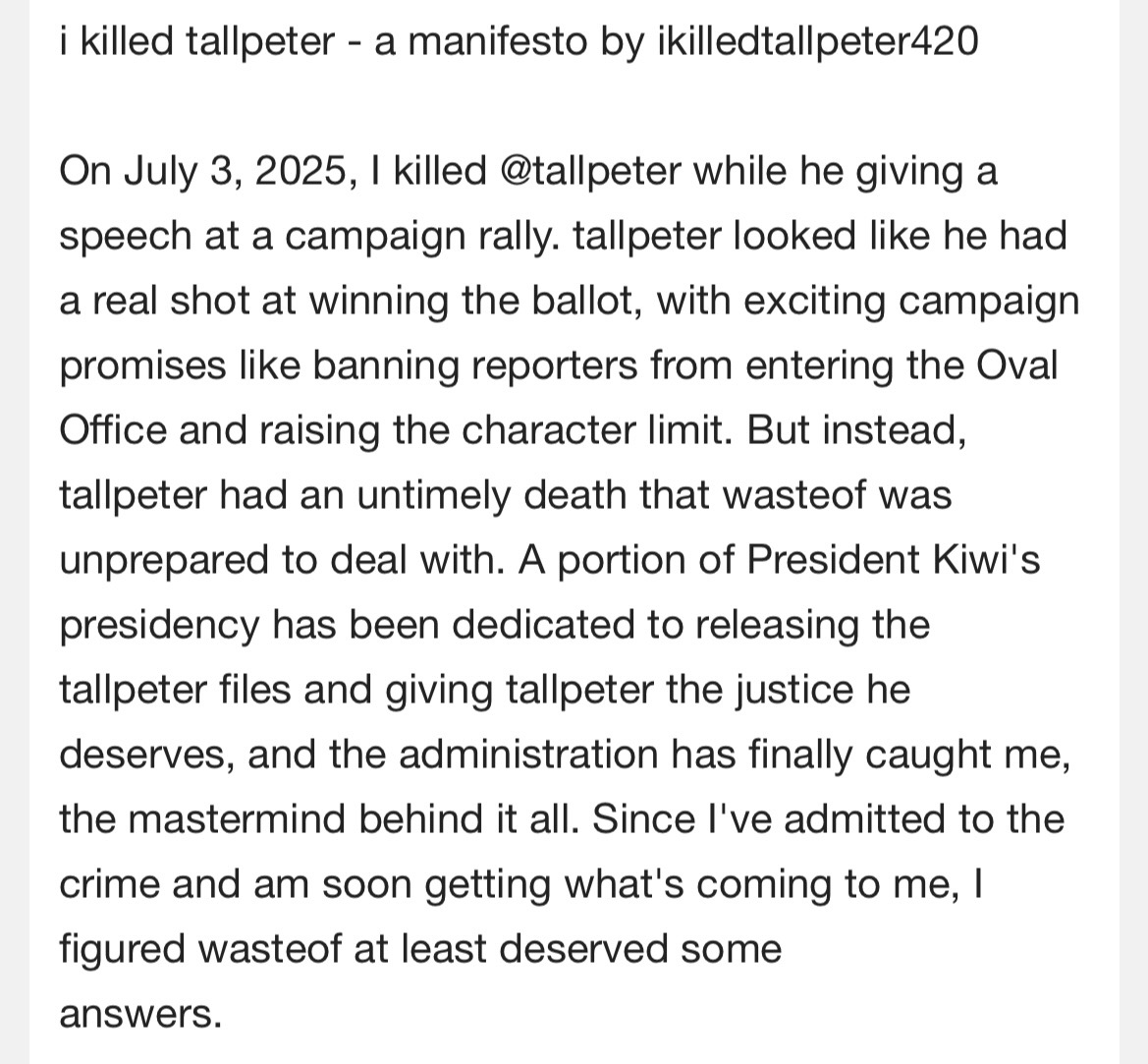 As part of our commitment to transparency, we have released ikilledtallpeter420’s manifesto that reads like gibberish for the public to scoff at.