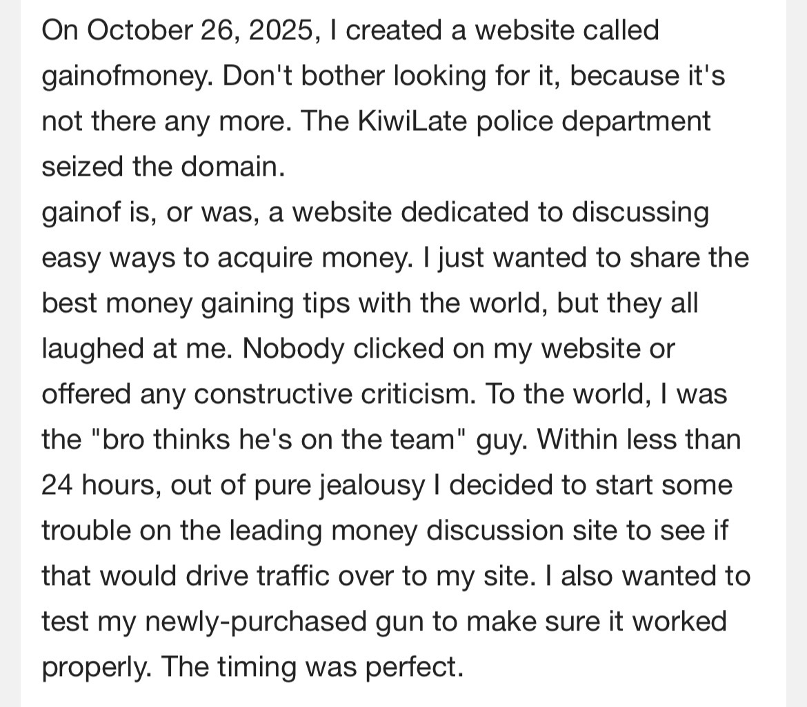 As for me, the president of wasteof dot money, I have been escorted by the KiwiLate Ok Fine We’re Just Making Up Departments Now department to the fastest economy-class plane they could find. Yes, after my unusually long leave of absence, I will finally be returning to the one sane place that is Wasteoftopia and fulfilling my normal obligations. They said this was for “safety” or some dumb new DEI woke thing. Unbelievable!