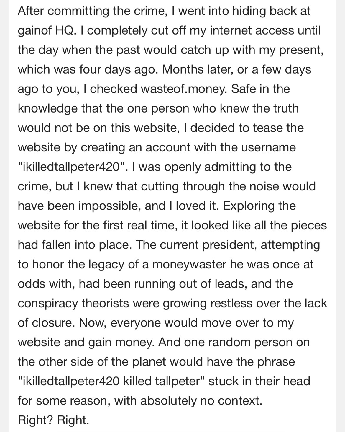 After a really long, boring, and drawn-out saga to catch the terrible individual responsible for murdering @tallpeter in cold blood, me and Late have successfully identified this blight on the wasteof community and would like to invite you to publicly shame them alongside us.
