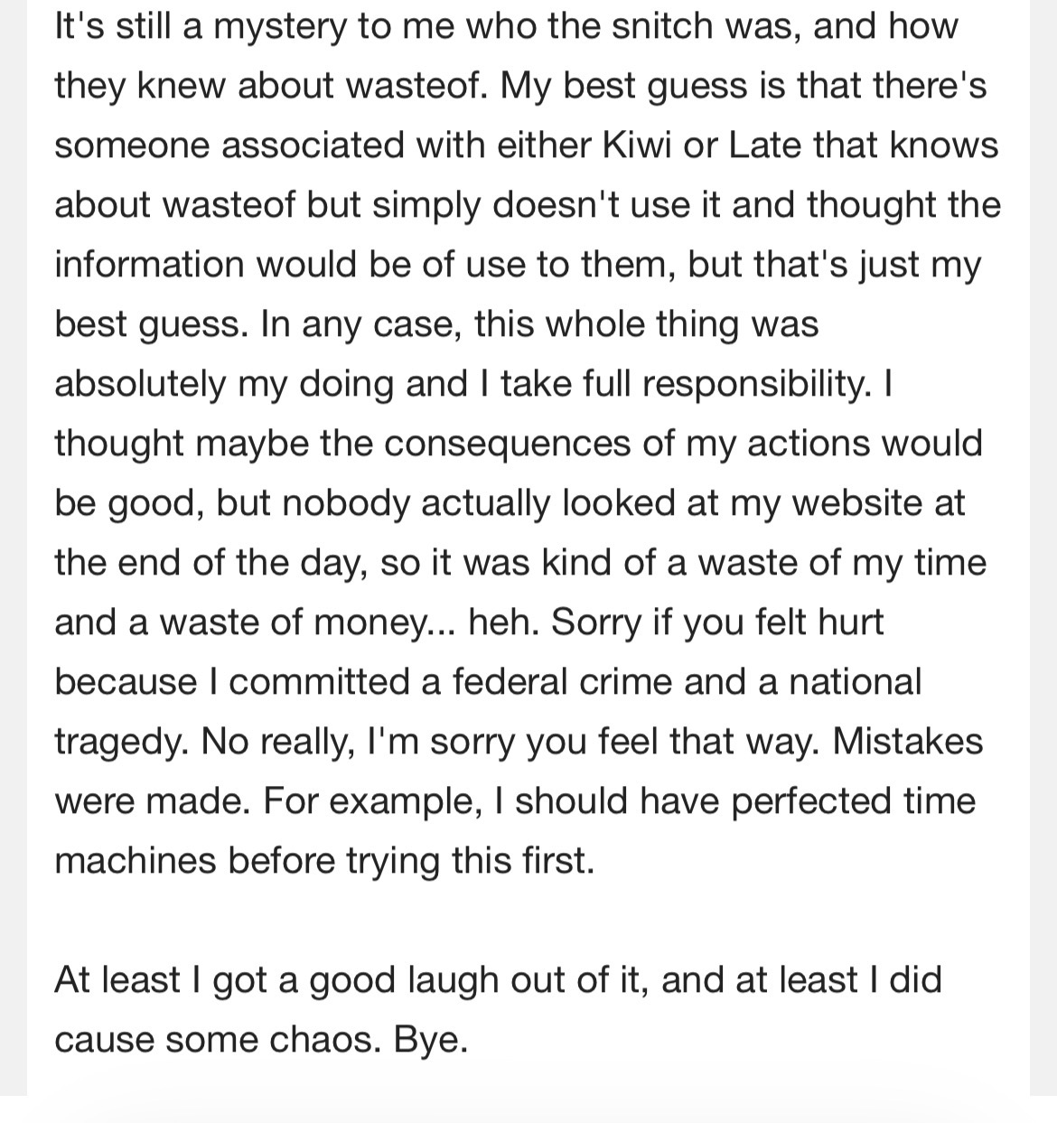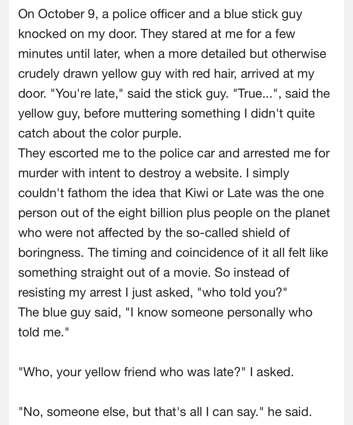 Thank you all for your support over the course of these past 30 days. I know you all were so worried about me and wanted an easily accessible lifelog because we all know the world revolves around me, but fear not, for KiwiLate, and its accompanying justice system, has returned in all its glory.