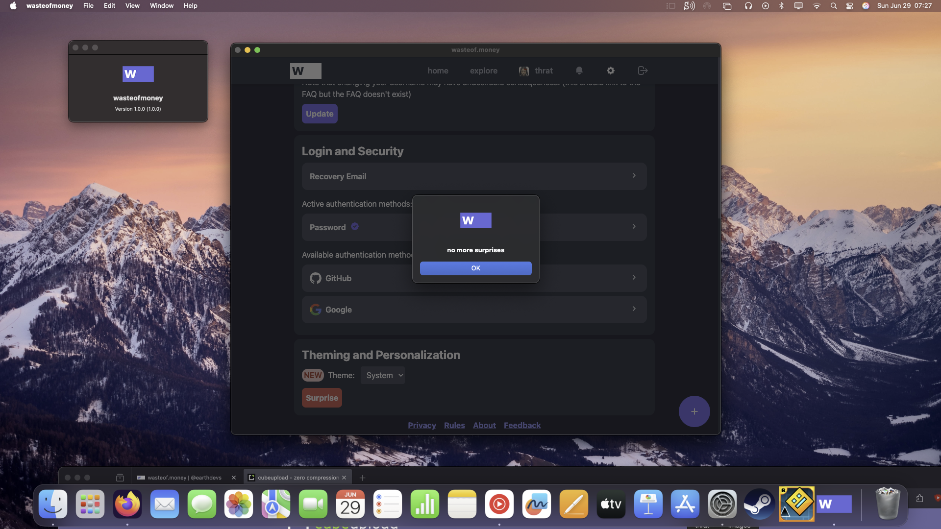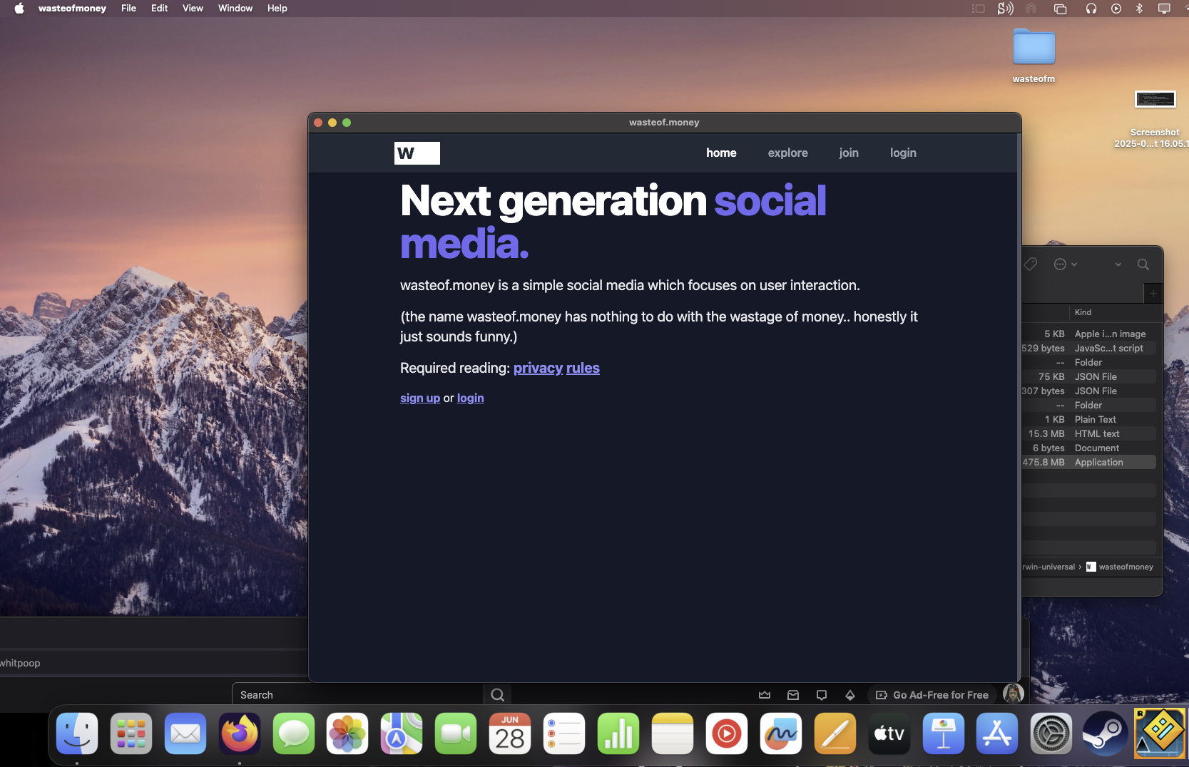 The wasteof client for macOS is completely finished! All bugs have been patched aside from the image posting one, as this is due to the wasteof money website normally opening an alert with a textbox, a feature Electron intentionally lacks for security purposes. Until Jeffalo decides to make a custom non-alert bubble for it, this bug will remain. I will not be distributing the wasteof mac client until I get Jeffalo’s approval. Anyway uhh #KiwiForPresident2025